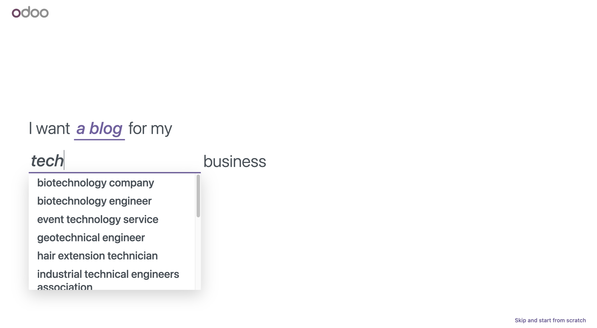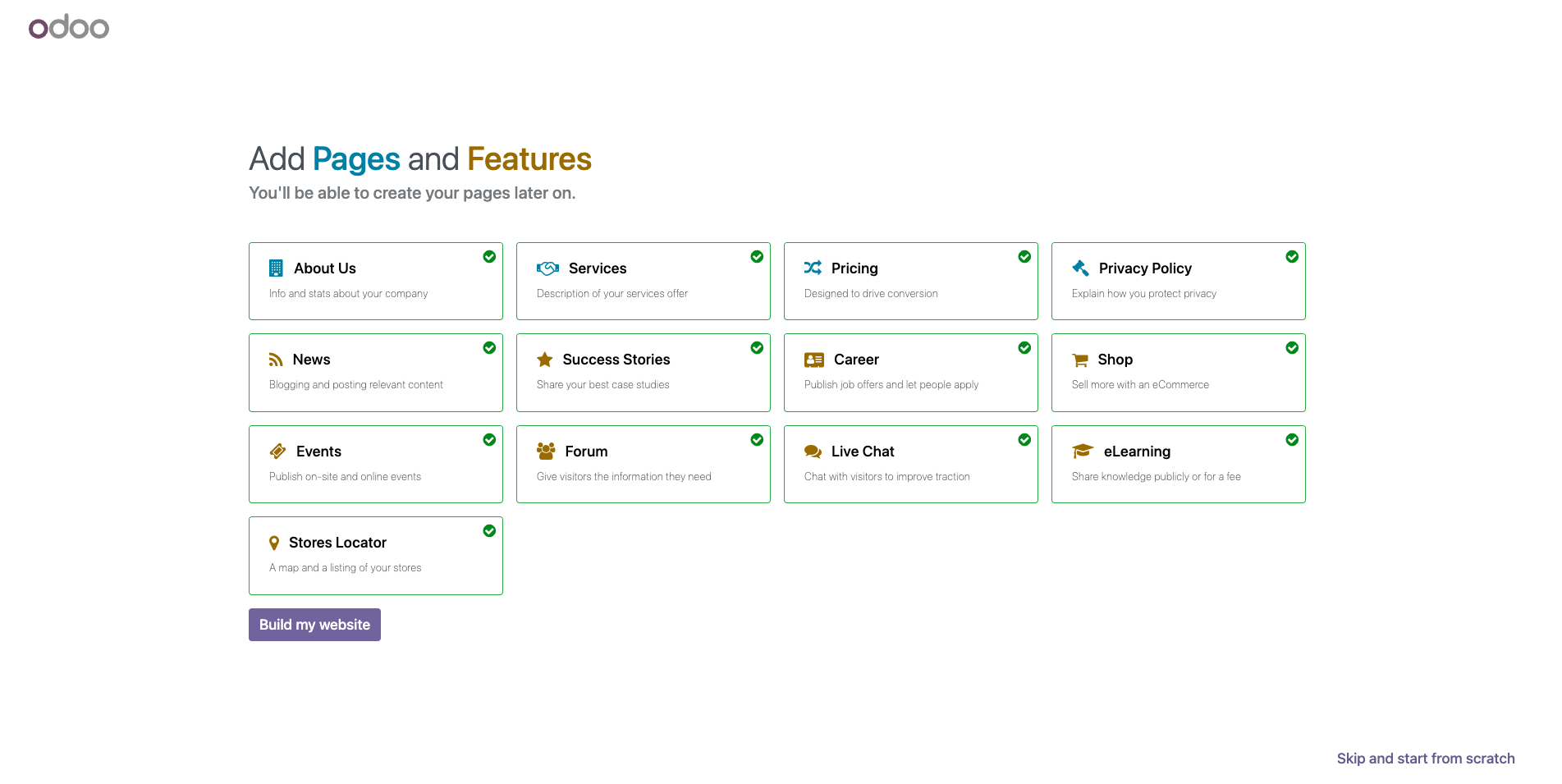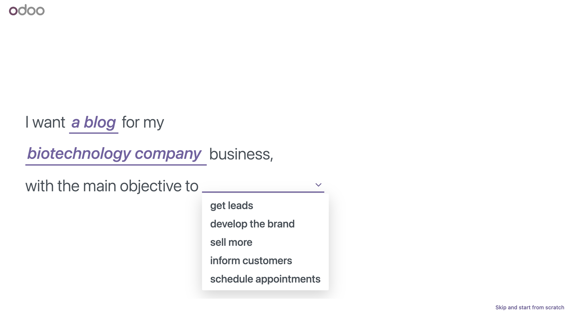 Odoo CMS greets you with a helpful wizard that asks what you’re looking to achieve.
