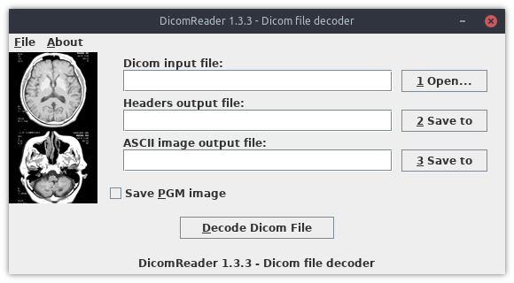 DicomReader is a Java-based tool developed for Volumetric Bias Correction that reads DICOM files, handling both headers and images. It saves data into plain text files and optionally provides a pgm image version.