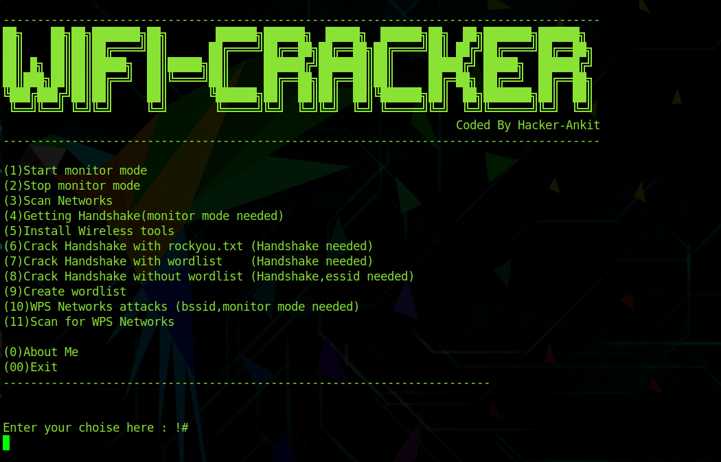 Its features include : WPS Networks attacks, WPS scanner, and Crack Handshake, Crack Handshake with and without wordlist.