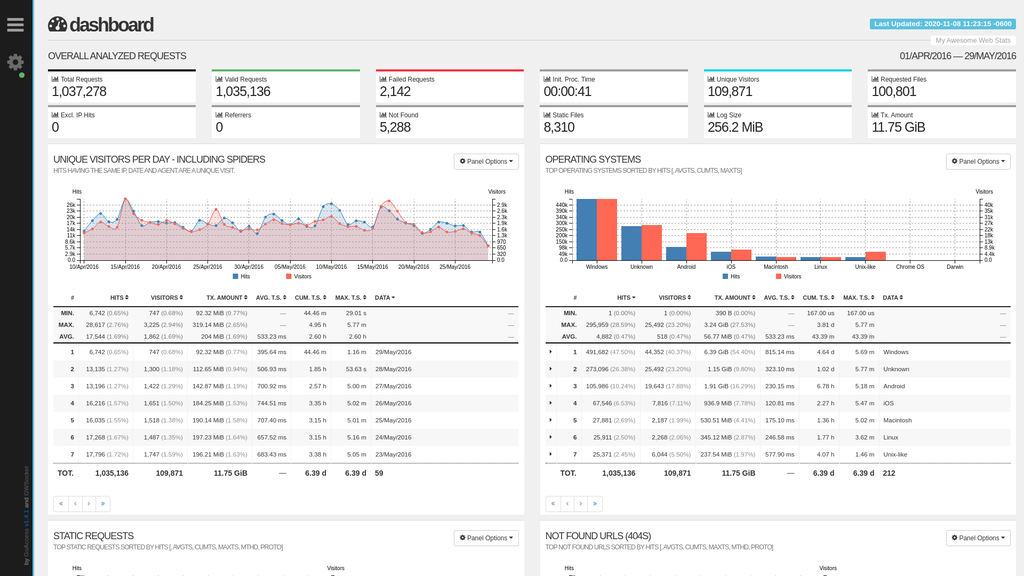 - Comprehensive Reports: Generates detailed reports on metrics such as visitors, HTTP status codes, referrers, and user agents.