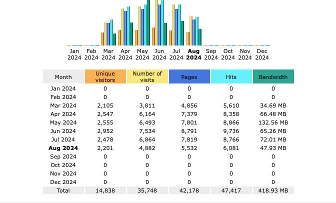 - Comprehensive Traffic Analysis: Tracks visits, unique visitors, page views, and bandwidth usage.