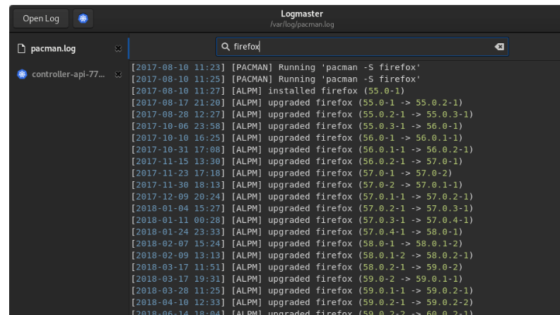 Logmaster is a log viewer for Linux built with GTK and D. Features include being able to read very large files (multiple gigabytes and bigger than user's memory), highlighting, searching, following, kubernetes support, unix pipe support and more.