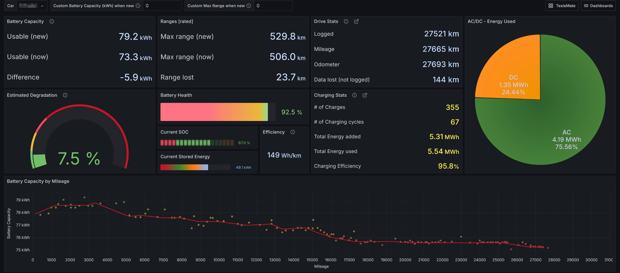 TeslaMate comes with a rich set of pre-configured Grafana dashboards that make it easy to visualize your data. You’ll always know how your Tesla is performing, and how you can get even more out of it.